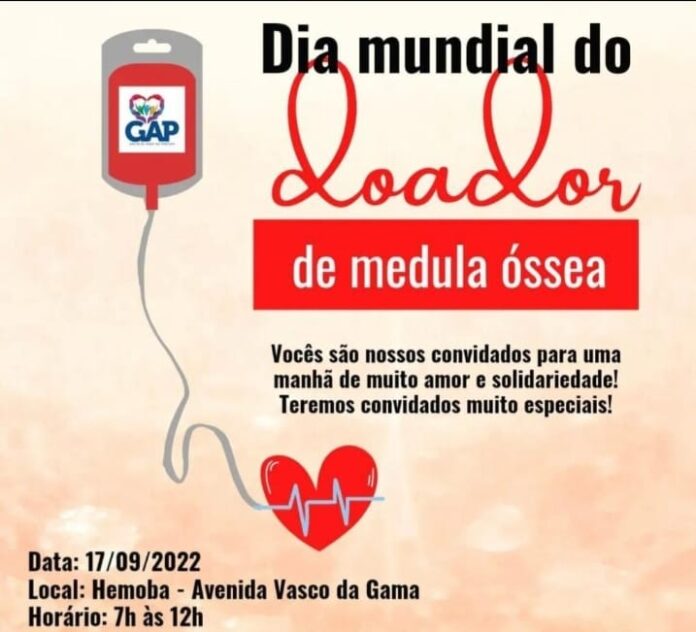 No dia 17 de setembro, próximo sábado, acontecerá o “Dia Mundial do Doador de Medula Óssea” e o Grupo de Amor ao Próximo- GAP, estará das 7 às 12h com diversas atividades culturais em prol desta data tão significativa.