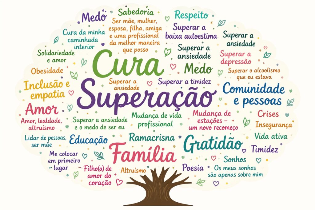 O painel coletivo denominado “Árvore da Cura” reuniu folhas preenchidas à mão por diferentes participantes, evidenciando a diversidade de expressões e caligrafias. A partir desse material, foi possível identificar padrões simbólicos recorrentes entre um grupo diverso, como cura, superação, família, medo e educação.