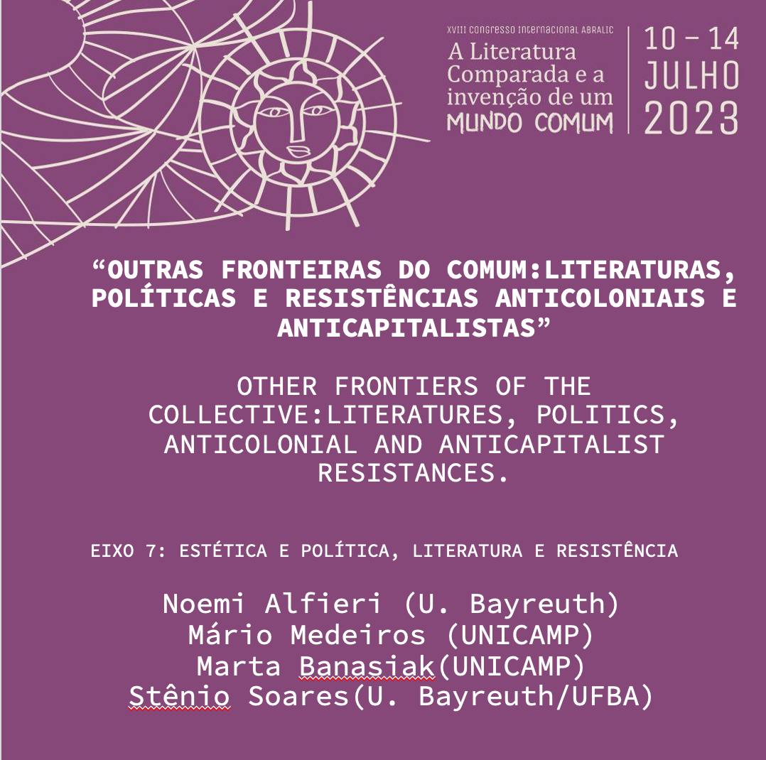 XVIII Congresso da ABRALIC, em Salvador (10 a 14 de Julho de 2023). O simpósio é interdisciplinar e são bem-vindas comunicações, atuações, performances que lidem