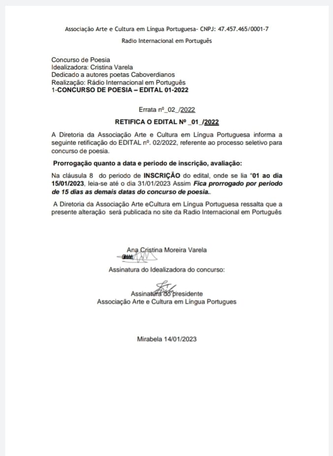 O presente edital visa contribuir para a promoção de autores caboverdianos e espalhar a poesia de Cabo-Verde pelo mundo. Um projecto que depois será expandido por outros países. Concurso tem como tema: Fla mantenha cu poesia (cumprimentar-se com poesias). E, as condições de participação encontram-se no link abaixo.